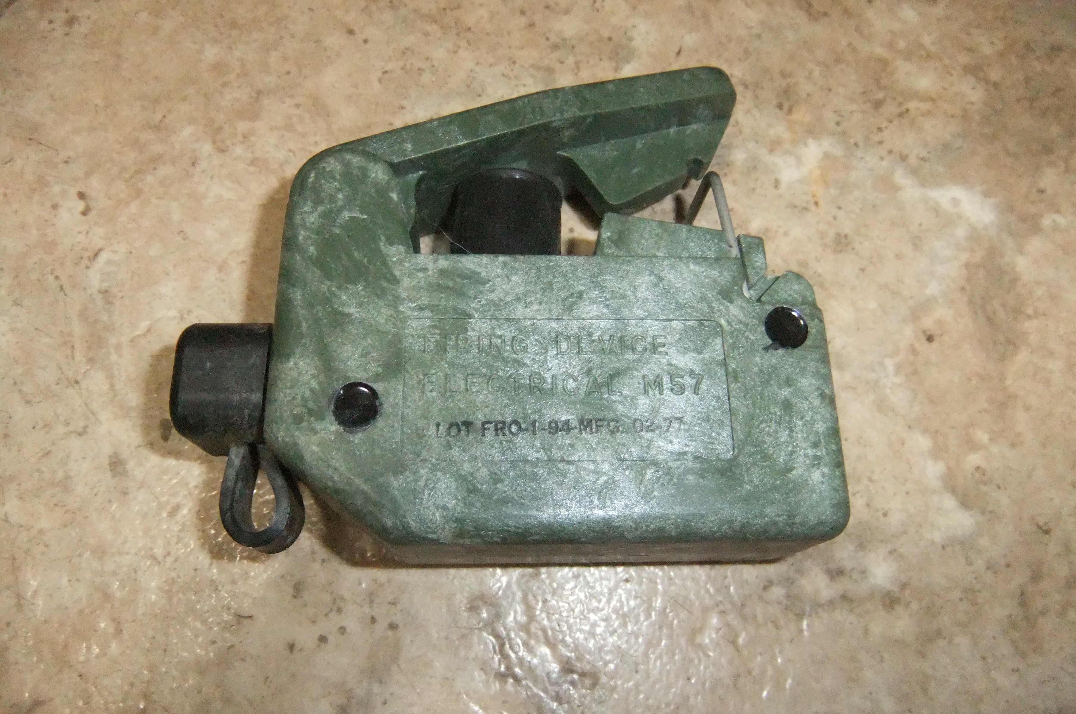 The M57 "Clacker" is the standard U.S. military electrical firing device (detonator) for the M18A1 Claymore anti-personnel mine. It is a hand-held, spring-loaded generator that sends an electrical charge through a firing wire to detonate the mine. It is famously recognizable by its olive-drab, ruggedized design and has been in use since the Vietnam War.